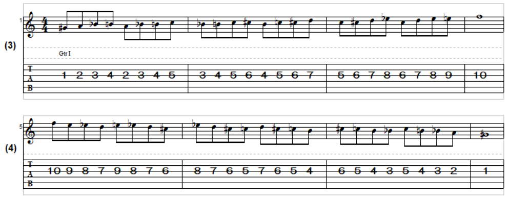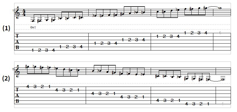 これの応用編と言いますか、トモ藤田さんのYOUTUBE動画にも上記と似た良さげな練習方法見つけましたのでそれを参考に採譜してみました。同じ弦を横にクロマチックで移動していく練習です。