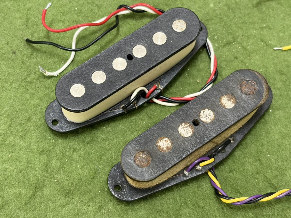 ポールピース錆びだらけの紫、黄色、黒の配線の方はフロント用で抵抗値4.9kΩ(タップ時2.9kΩ)で、赤、白、黒色の配線の方はセンター用で抵抗値8.5kΩ(タップ時5.6kΩ)でした。