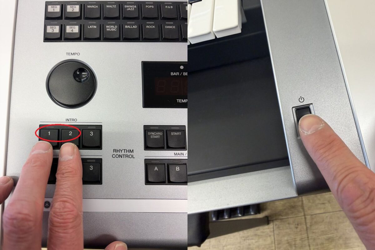 まず、操作パネル左側のINTRO【1】と【2】のボタン押しながら電源ONにします。